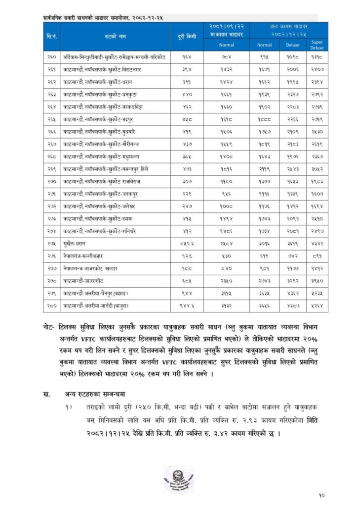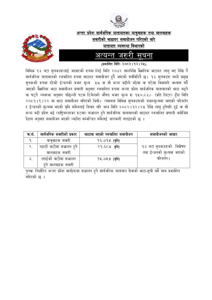 विभागका अनुसार बढेको भाडा दर अन्तरप्रदेशीय गन्तव्यहरूमा मात्र लागू हुनेछ। एकै प्रदेशभित्र सञ्चालन हुने सवारी साधनको भाडा निर्धारण भने सम्बन्धित प्रदेश सरकारले गर्ने व्यवस्था रहेको छ।