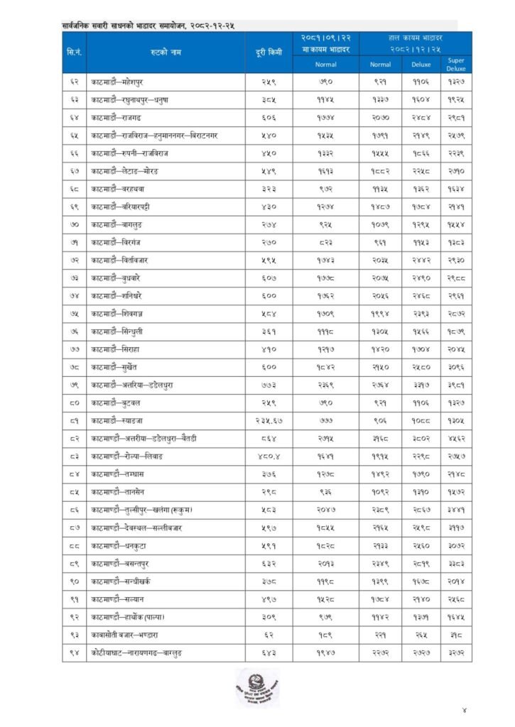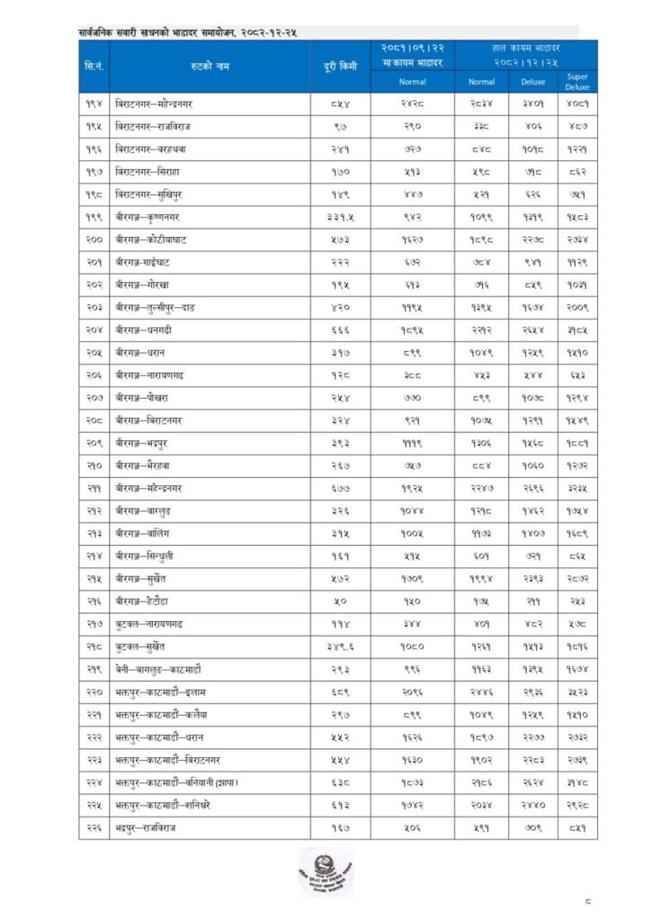 नयाँ भाडादर आजैबाट लागू भइसकेको छ। यसअनुसार यात्रुबाहक सवारी साधनको भाडा १६.७१ प्रतिशतले बढाइएको छ। त्यस्तै, पहाडी क्षेत्रमा सञ्चालन हुने मालबाहक सवारी साधनको भाडा २१.६८ प्रतिशतले वृद्धि भएको छ भने तराई क्षेत्रमा सञ्चालन हुने मालबाहक सवारी साधनको भाडा १५.७५ प्रतिशतले बढाइएको विभागले जनाएको छ।